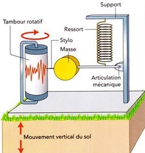 Les sismographes sont conçus de manière à ce que de légères vibrations terrestres déplacent les instruments ; la masse suspendue (M) a cependant tendance à rester au repos, et son stylet enregistreur perçoit cette différence de mouvement qui s'inscrit sur un tambour rotatif.