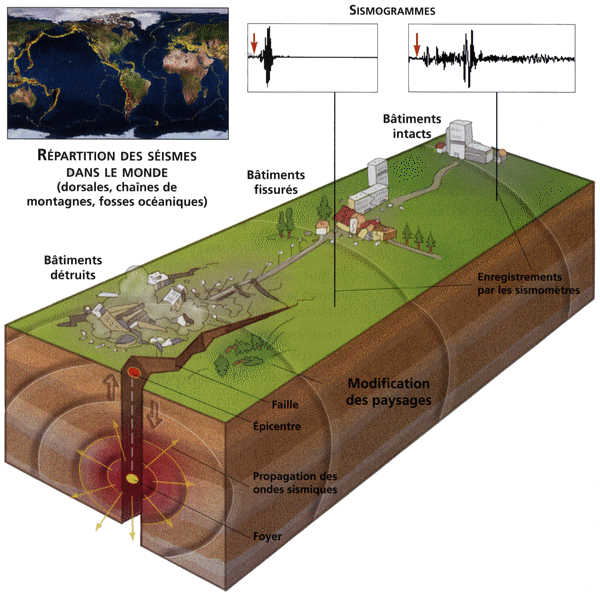 •L’épicentre, qui est l’emplacement à la surface de la terre en dessous duquel le tremblement de terre s’est produit.