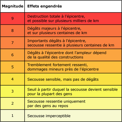C'est une échelle dite logarithmique : un séisme atteignant 5 sur l'échelle de Richter est en fait 10 fois plus puissant qu'un séisme de magnitude 4. En principe, cette échelle n'a pas de limite supérieure. Mais les géologues estiment qu'étant donné la résistance maximale des roches terrestres, aucun séisme supérieur à 10 ne pourra jamais être enregistré. La limite inférieure de l'échelle de Richter est déterminée par la sensibilité des sismographes. Les plus sensibles sont capables de détecter la chute d'une brique depuis une hauteur de 1 mètre, événement qui produit une magnitude de 2. Concrètement, il faut qu'un séisme atteigne une magnitude de 3 sur l'échelle de Richter pour qu'il ait une chance d'être ressenti par des humains. À partir de 4, on le ressent nettement, mais il n'y a généralement pas de dégâts causés aux habitations. À partir de 5, les premiers dégâts peuvent apparaître.